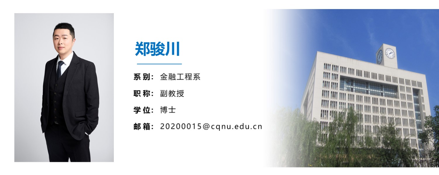 郑骏川,男,汉族,1985年10月生,重庆沙坪坝人,博士,副教授,硕士生导师,重庆市金融学会理事,重庆市区域经济学会理事,重庆市统计学会理事,研究研究领域为金融创新理论与实务、农村经济与金融、区域经济与发展、数据统计与分析。主持重庆市社科规划项目、重庆市教委人文社科项目、重庆市教委社区教育项目、重庆市教育科学规划项目等省级项目6项;主持重庆市发改委重大决策咨询课题、重庆市统计科研课题、重庆市第四次全国经济普查研究课题、重庆市第七次全国人口普查课题、重庆市金融领域重大决策咨询课题等横向项目共计6项;在《人民日报(理论版)》《宏观经济研究》《中南财经政法大学学报》《湖北社会科学》《技术经济与管理研究》等CSSCI来源期刊上发表论文10余篇;咨询报告被重庆市统计局、人民银行重庆营业管理部采纳、《中国中心城市发展报告2021》采纳4次;出版学术著作2部。