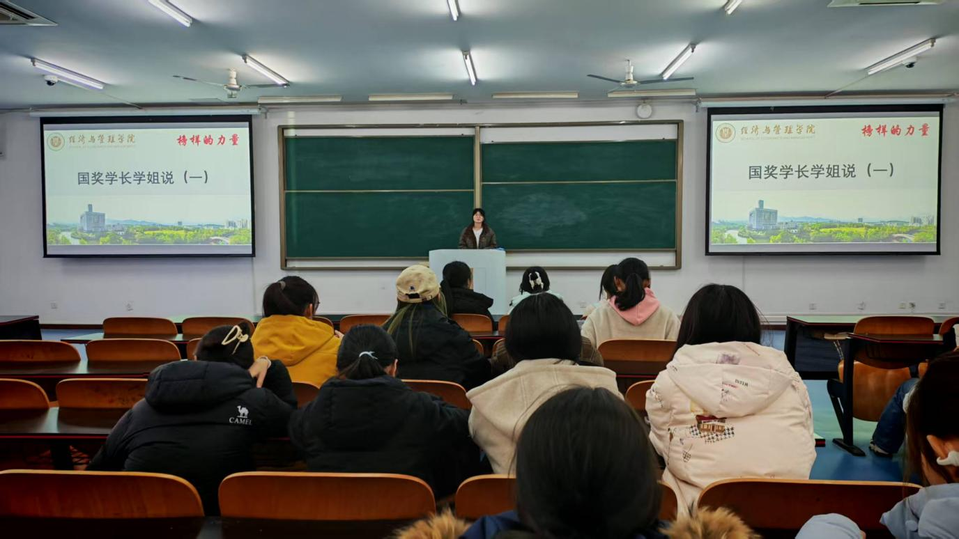 于砺志楼T2507开展国家奖学金获得者经验分享会。本次活动由2023级财务管理专业陈苗、经济学专业洪子珺两位国家奖学金获得者担任分享人,2025级全体学生参与。