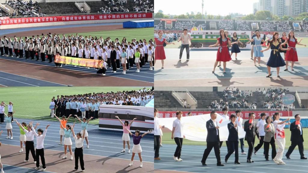 方阵步伐整齐、口号嘹亮。表演方队以“绿皮火车”到“高铁”的时代变迁为创意,融合专业特色与艺术表现,展现了凯旋国际